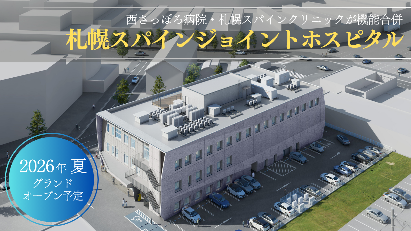2026年初夏、札幌スパインクリニックは西さっぽろ病院と機能合併し、脊椎と関節の専門病院【札幌スパインジョイントホスピタル】として、札幌市中央区桑園地区で、病床数56床(手術室3室)の脊椎と関節の専門病院としてスタート致します。